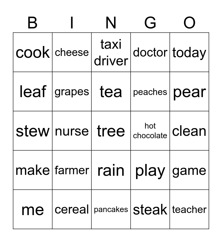 This bingo card has 32 words: me, we, tree, weed, clean, leaf, grapes, pancakes, peaches, hamburgers, stew, cheese, pasta, steak, pear, yogurt, cereal, tea, hot chocolate, game, make, paint, rain, play, today, cook, nurse, taxi driver, doctor, teacher, student and farmer.