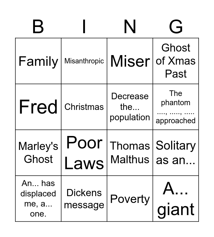 This bingo card has 20 words: Solitary as an..., Scrooge, Miser, Redemption, An... has displaced me, a... one., Fred, Dickens message, Family, Marley's Ghost, Misanthropic, Poor Laws, Thomas Malthus, Christmas, A... giant, Decrease the... population, Ignorance and Want, The phantom ...., ....., ..... approached, Ghost of Xmas Past, Poverty and Tiny Tim.