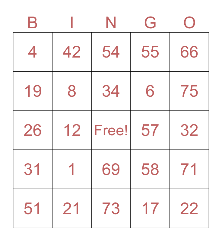 This bingo card has a free space and 24 words: 1, 21, 34, 51, 66, 4, 19, 42, 57, 69, 6, 26, 58, 71, 8, 17, 32, 54, 75, 12, 22, 31, 55 and 73.