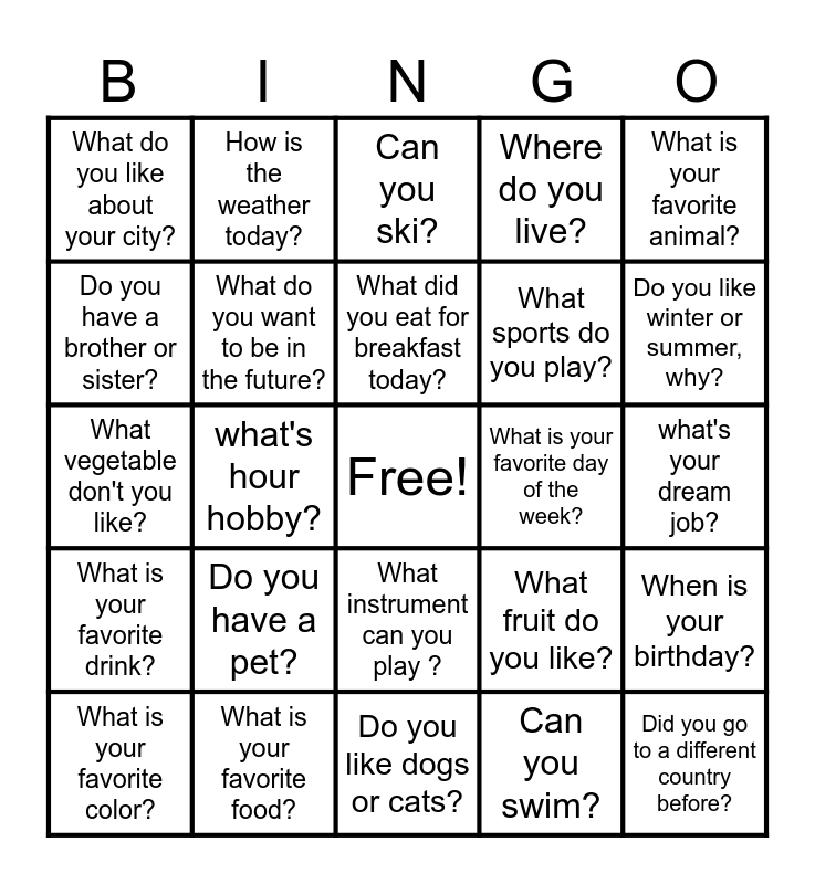 This bingo card has a free space and 24 words: Do you have a pet?, What is your favorite food?, What did you eat for breakfast today?, What is your favorite color?, What is your favorite animal?, What do you like about your city?, Do you have a brother or sister?, How is the weather today?, What is your favorite day of the week?, What instrument can you play ?, What sports do you play?, What vegetable don't you like?, What fruit do you like?, When is your birthday?, What do you want to be in the future?, Can you swim?, what's your dream job?, Can you ski?, Do you like winter or summer, why?, what's hour hobby?, Did you go to a different country before?, What is your favorite drink?, Where do you live? and Do you like dogs or cats?.