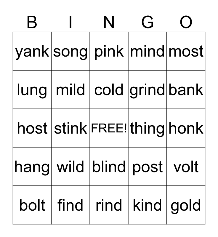 This bingo card has a free space and 24 words: wild, find, cold, bolt, most, yank, lung, song, thing, blind, grind, host, post, volt, mild, kind, honk, pink, bank, stink, gold, hang, mind and rind.