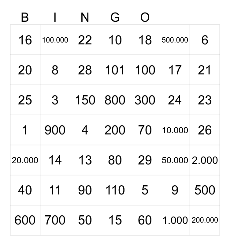This bingo card has 58 words: 0, 1, 2, 3, 4, 5, 6, 7, 8, 9, 10, 11, 13, 14, 15, 16, 17, 18, 19, 20, 21, 22, 23, 24, 12, 25, 26, 27, 28, 29, 30, 40, 50, 60, 70, 80, 90, 100, 101, 110, 150, 200, 300, 400, 500, 600, 700, 800, 900, 1.000, 2.000, 10.000, 20.000, 50.000, 100.000, 200.000, 500.000 and 1.000.000.