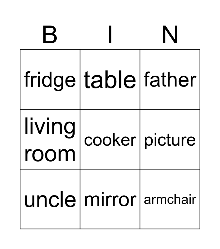 This bingo card has 26 words: bookshelf, sofa, mirror, wardrobe, cooker, fridge, picture, table, bed, bath, armchair, shower, chair, bedroom, bathroom, kitchen, living room, mother, father, sister, brother, grandfather, grandmother, aunt, uncle and cousin.
