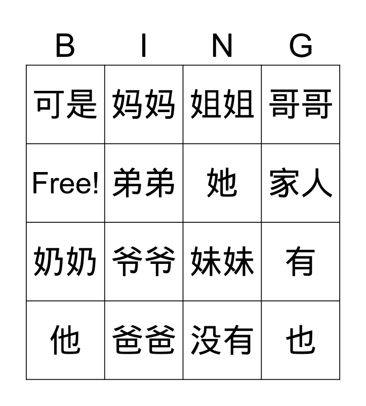 This bingo card has 16 words: 爸爸, 有, 姐姐, 可是, 奶奶, 妈妈, 妹妹, 没有, Free!, 弟弟, 他, 哥哥, 爷爷, 家人, 她 and 也.
