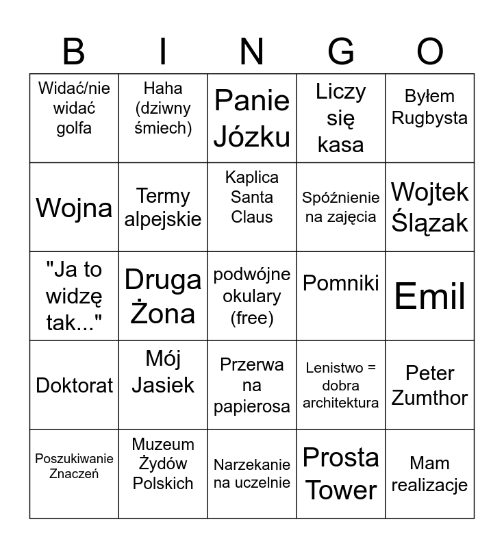 This bingo card has a free space and 24 words: Mój Jasiek, Muzeum Żydów Polskich, Kaplica Santa Claus, Poszukiwanie Znaczeń, Byłem Rugbysta, Widać/nie widać golfa, Wojna, Haha (dziwny śmiech), Pomniki, Przerwa na papierosa, Spóźnienie na zajęcia, "Ja to widzę tak...", Lenistwo = dobra architektura, Peter Zumthor, Termy alpejskie, Prosta Tower, Emil, Panie Józku, Wojtek Ślązak, Druga Żona, Mam realizacje, Doktorat, Liczy się kasa and Narzekanie na uczelnie.