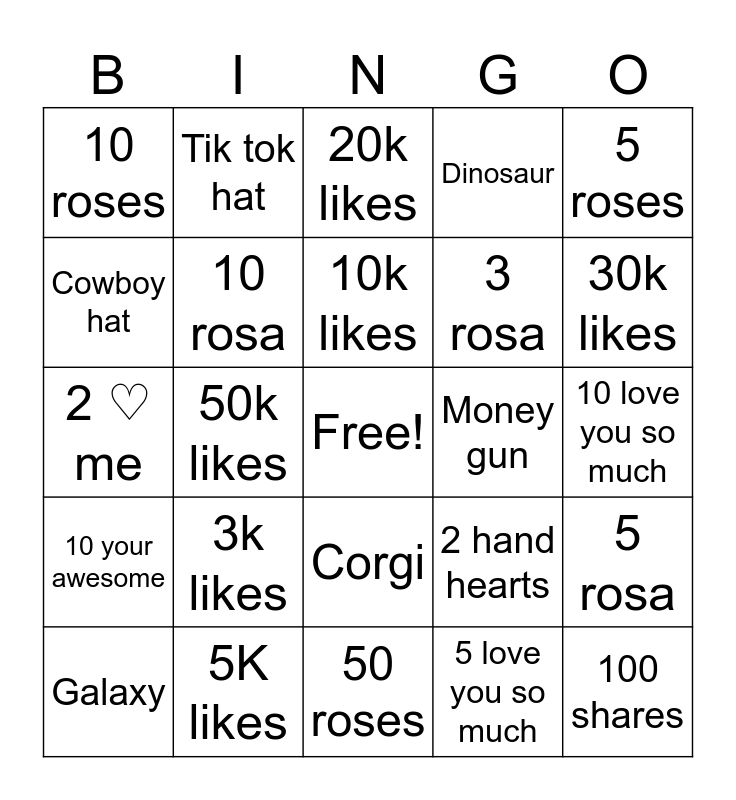 This bingo card has a free space and 24 words: 3k likes, 5K likes, 10k likes, Galaxy, 5 roses, 10 roses, Cowboy hat, Tik tok hat, Money gun, Corgi, 3 rosa, 2 ♡ me, 2 hand hearts, 5 rosa, 10 rosa, 5 love you so much, 10 love you so much, 20k likes, 30k likes, 50k likes, 100 shares, 10 your awesome, Dinosaur and 50 roses.