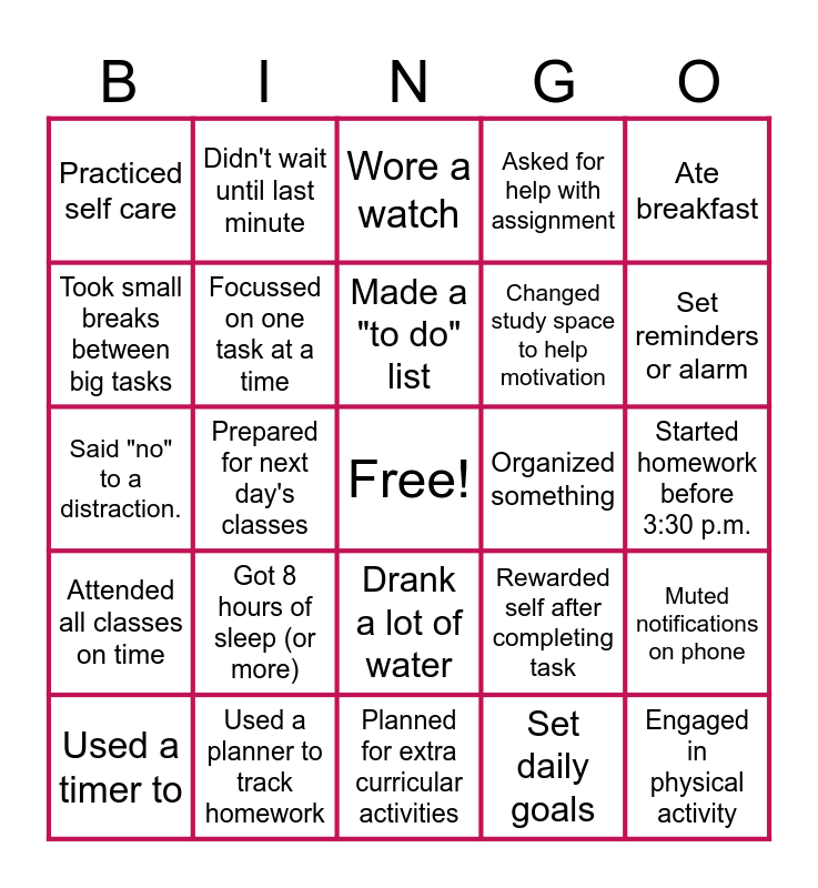 This bingo card has a free space and 24 words: Got 8 hours of sleep (or more), Used a planner to track homework, Made a "to do" list, Used a timer to, Ate breakfast, Practiced self care, Took small breaks between big tasks, Didn't wait until last minute, Organized something, Drank a lot of water, Changed study space to help motivation, Said "no" to a distraction., Rewarded self after completing task, Muted notifications on phone, Focussed on one task at a time, Set daily goals, Started homework before 3:30 p.m., Wore a watch, Set reminders or alarm, Prepared for next day's classes, Engaged in physical activity, Attended all classes on time, Asked for help with assignment and Planned for extra curricular activities.