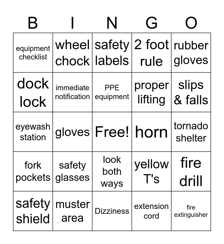This bingo card has a free space and 24 words: safety glasses, muster area, PPE equipment, safety shield, rubber gloves, equipment checklist, dock lock, wheel chock, horn, look both ways, proper lifting, eyewash station, yellow T's, fire drill, immediate notification, extension cord, tornado shelter, safety labels, slips & falls, gloves, fire extinguisher, fork pockets, 2 foot rule and Dizziness.