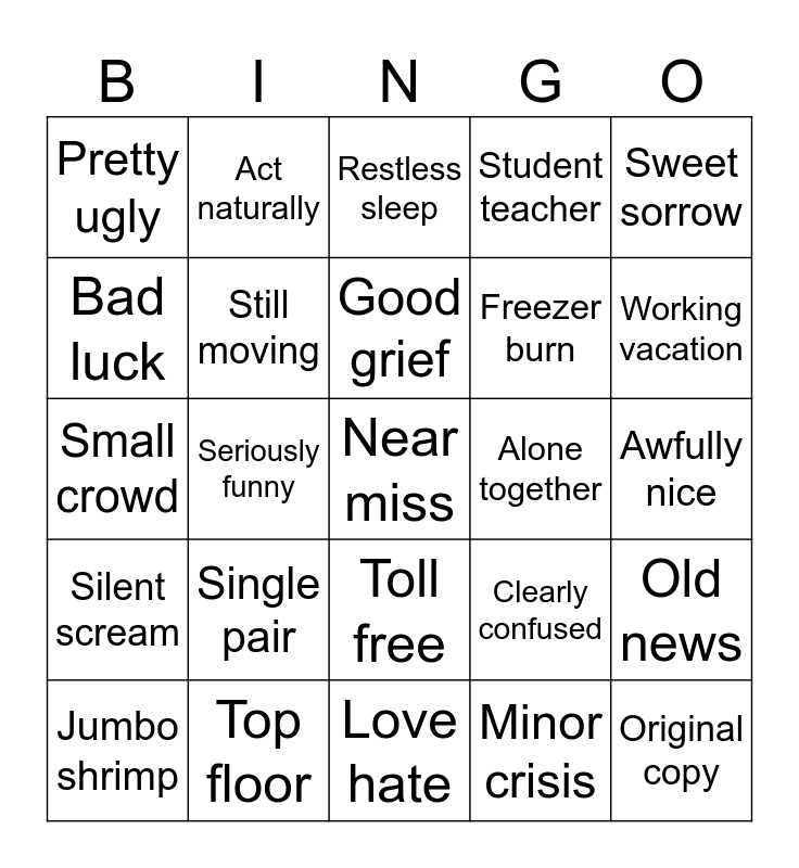 This bingo card has 28 words: Old news, Never again, Freezer burn, Minor crisis, Bad luck, Restless sleep, Act naturally, Silent scream, Alone together, Jumbo shrimp, Small crowd, Student teacher, Top floor, Love hate, Working vacation, Wise fool, Single pair, Still moving, Good grief, Toll free, Pretty ugly, Original copy, Near miss, Seriously funny, Awfully nice, Clearly confused, Sweet sorrow and Crash landing.