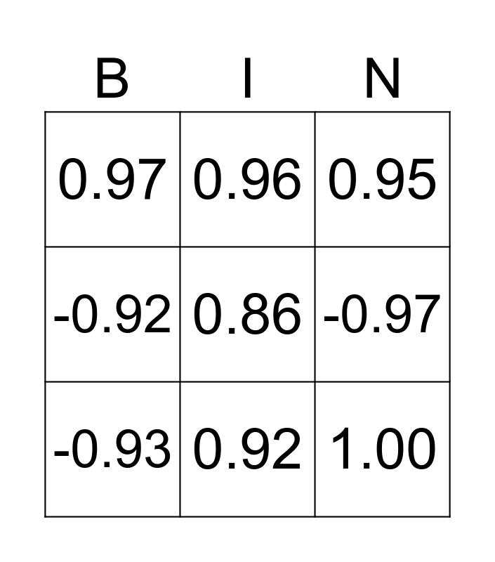 This bingo card has a free space and 8 words: -0.97, 0.95, 0.96, -0.93, 0.97, 1.00, -0.92 and 0.92.