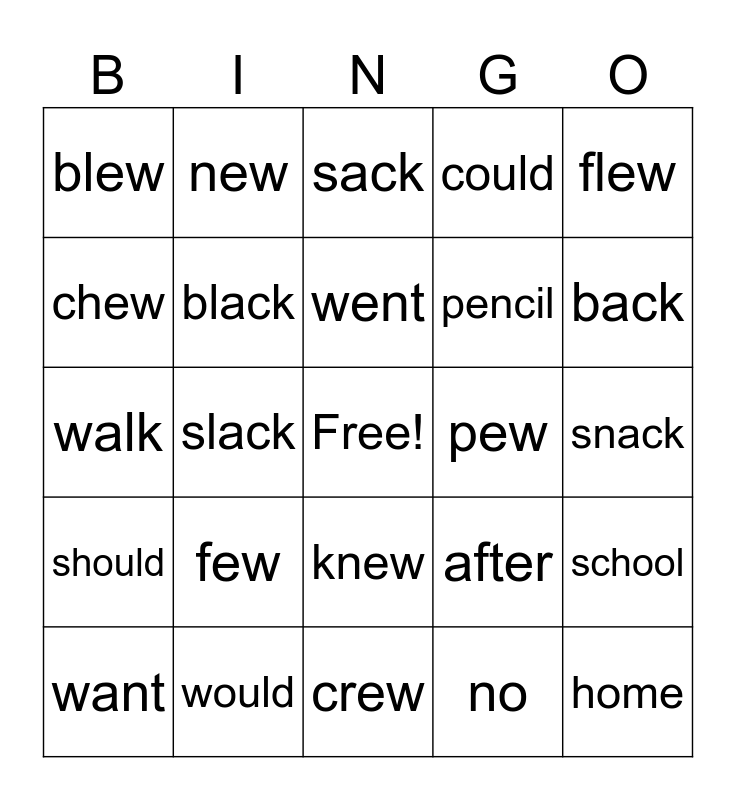 This bingo card has a free space and 25 words: few, crew, went, want, flew, blew, chew, new, pew, knew, pencil, walk, after, school, black, shack, snack, sack, back, slack, home, would, should, could and no.