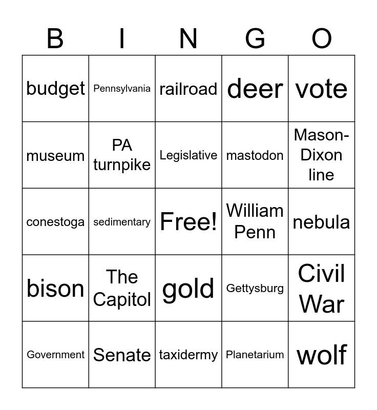 This bingo card has a free space and 24 words: The Capitol, Senate, Legislative, Government, vote, budget, museum, Pennsylvania, William Penn, gold, mastodon, conestoga, Gettysburg, Civil War, PA turnpike, Planetarium, nebula, railroad, Mason-Dixon line, sedimentary, wolf, bison, deer and taxidermy.