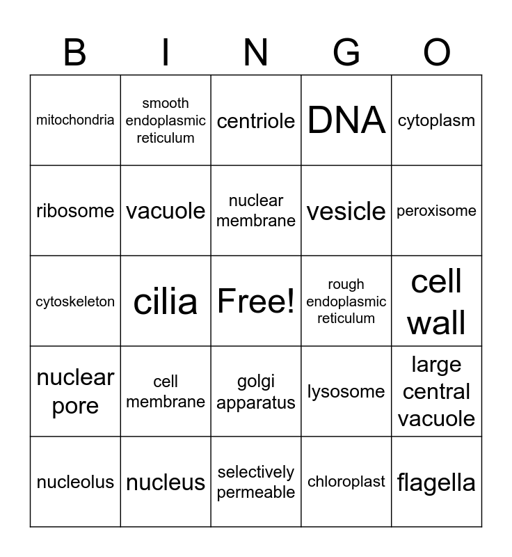 This bingo card has a free space and 24 words: cell membrane, nucleus, nuclear membrane, nucleolus, cytoplasm, mitochondria, ribosome, smooth endoplasmic reticulum, rough endoplasmic reticulum, golgi apparatus, vesicle, cytoskeleton, lysosome, large central vacuole, vacuole, chloroplast, cell wall, centriole, peroxisome, cilia, flagella, nuclear pore, DNA and selectively permeable.