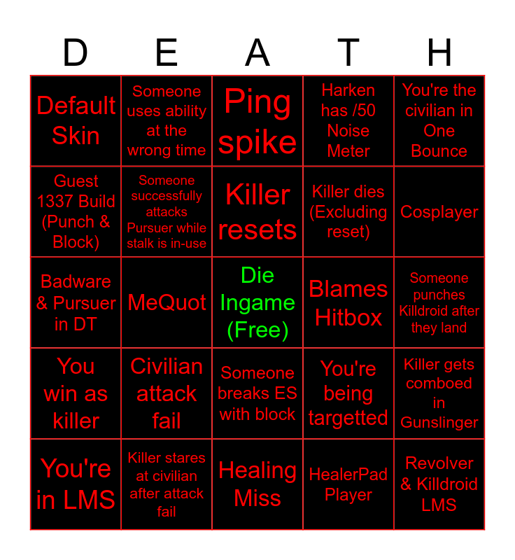 This bingo card has a free space and 24 words: Civilian attack fail, Killer stares at civilian after attack fail, Killer resets, You're in LMS, You're the civilian in One Bounce, Default Skin, Guest 1337 Build (Punch & Block), Someone uses ability at the wrong time, Blames Hitbox, Someone breaks ES with block, Killer dies (Excluding reset), Badware & Pursuer in DT, You're being targetted, Killer gets comboed in Gunslinger, Someone successfully attacks Pursuer while stalk is in-use, HealerPad Player, Someone punches Killdroid after they land, Ping spike, Cosplayer, MeQuot, Revolver & Killdroid LMS, You win as killer, Harken has /50 Noise Meter and Healing Miss.