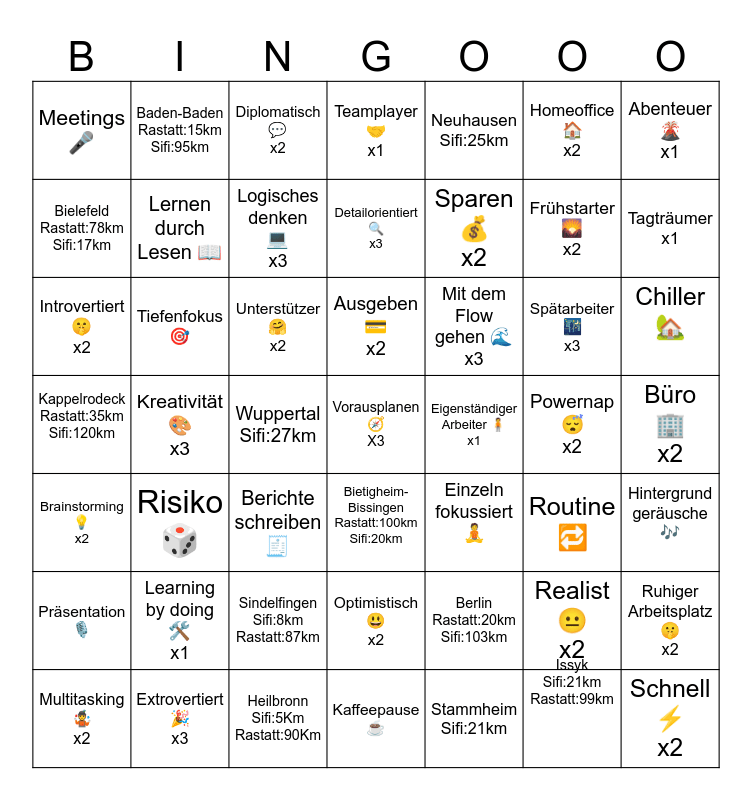This bingo card has a free space and 48 words: Berlin Rastatt:20km Sifi:103km, Frühstarter 🌄 x2, Kaffeepause ☕, Kreativität 🎨 x3, Unterstützer 🤗 x2, Büro 🏢 x2, Baden-Baden Rastatt:15km Sifi:95km, Extrovertiert 🎉 x3, Homeoffice 🏠 x2, Bietigheim-Bissingen Rastatt:100km Sifi:20km, Abenteuer 🌋 x1, Teamplayer 🤝 x1, Spätarbeiter 🌃 x3, Mit dem Flow gehen 🌊 x3, Präsentation 🎙️, Powernap 😴 x2, Bielefeld Rastatt:78km Sifi:17km, Tagträumer x1, Realist 😐 x2, Neuhausen Sifi:25km, Sparen 💰 x2, Wuppertal Sifi:27km, Meetings 🎤, Lernen durch Lesen 📖, Ruhiger Arbeitsplatz 🤫 x2, Logisches denken 💻 x3, Chiller🏡, Multitasking 🤹 x2, Ausgeben 💳 x2, Tiefenfokus 🎯, Issyk Sifi:21km Rastatt:99km, Eigenständiger Arbeiter 🧍 x1, Hintergrund geräusche 🎶, Learning by doing🛠️ x1, Kappelrodeck Rastatt:35km Sifi:120km, Einzeln fokussiert 🧘, Routine 🔁, Introvertiert 🤫 x2, Berichte schreiben 🧾, Sindelfingen Sifi:8km Rastatt:87km, Brainstorming 💡 x2, Schnell ⚡ x2, Diplomatisch 💬 x2, Heilbronn Sifi:5Km Rastatt:90Km, Detailorientiert 🔍 x3, Optimistisch 😃 x2, Risiko 🎲 and Stammheim Sifi:21km.