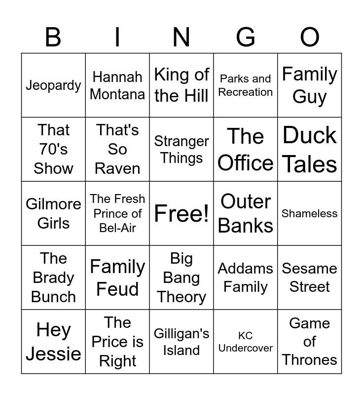 This bingo card has a free space and 66 words: King of the Hill, Gilligan's Island, Looney Toons, Sesame Street, Seinfeld, Orange is the New Black, Hannah Montana, Zack and Cody, Stranger Things, The Walking Dead, Big Bang Theory, How I Met Your Mother, Shameless, Family Guy, The Golden Girls, That 70's Show, The Fresh Prince of Bel-Air, Jeopardy, SpongeBob Squarepants, The Office, Family Feud, The Brady Bunch, Parks and Recreation, Pokemon, Full/Fuller House, Gravity Falls, Greys Anatomy, Criminal Minds, Game of Thrones, iCarly, Hey Jessie, Drake & Josh, Sam & Cat, Friends, Addams Family, The Price is Right, Beverly Hills 90210, Gilmore Girls, KC Undercover, South Park, That's So Raven, Little Einsteins, Outer Banks, Lab Rats, Pretty Little Liars, Teen Titans, Duck Tales, Malcom in the Middle, Wheel of Fortune, The Amazing World of Gumball, Zoey 101, Danny Phantom, Victorious, Jimmy Neutron, The X-Files, Dr. Who, Futurama, New Girl, King of the Hill, Gilligan's Island, Looney Toons, Sesame Street, Seinfeld, Orange is the New Black, Hannah Montana and Zack and Cody.