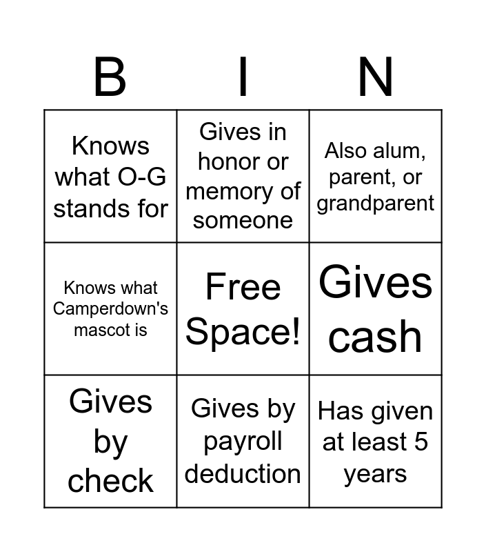 This bingo card has a free space and 11 words: Gave for the first time last year, Gives by payroll deduction, Has given at least 5 years, Gives by check, Gives in honor or memory of someone, Also alum, parent, or grandparent, Gives cash, Has given at least 10 years, Knows what Camperdown's mascot is, Knows what O-G stands for and Has been in Camperdown's previous building.
