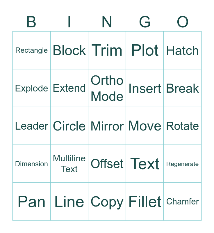 This bingo card has 30 words: Line, Polyline, Circle, Arc, Rectangle, Trim, Extend, Offset, Move, Copy, Rotate, Mirror, Fillet, Chamfer, Break, Join, Text, Dimension, Multiline Text, Hatch, Leader, Zoom, Block, Insert, Explode, Plot, Regenerate, Pan, Ortho Mode and Layer.