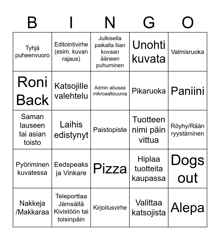 This bingo card has 29 words: Nakkeja /Makkaraa, Saastainen setup tai keittiötaso, Laihis edistynyt, Alepa, Tyhjä puheenvuoro, Julkisella paikalla liian kovaan ääneen puhuminen, Katsojille valehtelu, Eedspeaks ja Vinkare, Tuotteen nimi päin vittua, Teleporttaa Jämsältä Kivistöön tai toisinpäin, Röyhy/Rään ryystäminen, Paistopiste, Kirjoitusvirhe, Valittaa katsojista, Paniini, Editti ääniraidan perusteella, Pizza, Pyöriminen kuvatessa, Valmisruoka, Saman lauseen tai asian toisto, Hiplaa tuotteita kaupassa, Turhanpäiväinen valitus, Pikaruoka, Roni Back, Unohti kuvata, Editointivirhe (esim. kuvan rajaus), Dogs out, Admin abusaa mikroaaltouunia and Metateksti.