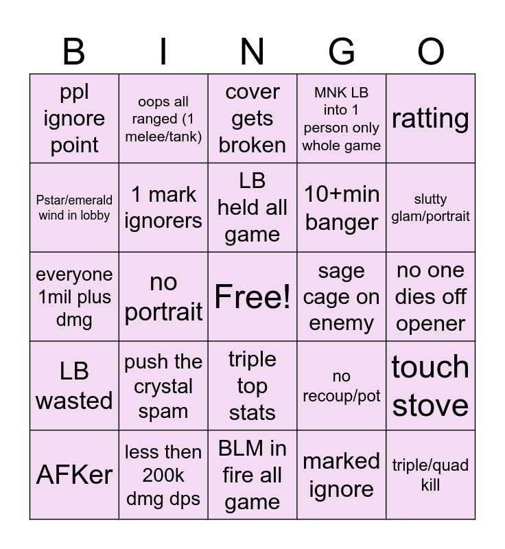 This bingo card has a free space and 24 words: push the crystal spam, less then 200k dmg dps, LB held all game, AFKer, ratting, ppl ignore point, Pstar/emerald wind in lobby, oops all ranged (1 melee/tank), sage cage on enemy, triple top stats, 10+min banger, everyone 1mil plus dmg, no recoup/pot, touch stove, 1 mark ignorers, marked ignore, no one dies off opener, cover gets broken, slutty glam/portrait, no portrait, triple/quad kill, LB wasted, MNK LB into 1 person only whole game and BLM in fire all game.