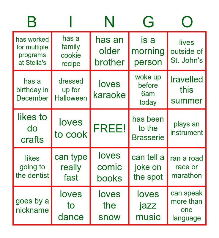 This bingo card has a free space and 24 words: can type really fast, loves to dance, loves karaoke, goes by a nickname, lives outside of St. John's, has worked for multiple programs at Stella's, has a birthday in December, has a family cookie recipe, has been to the Brasserie, loves comic books, woke up before 6am today, likes to do crafts, can tell a joke on the spot, ran a road race or marathon, dressed up for Halloween, loves jazz music, plays an instrument, has an older brother, travelled this summer, loves to cook, can speak more than one language, likes going to the dentist, is a morning person and loves the snow.