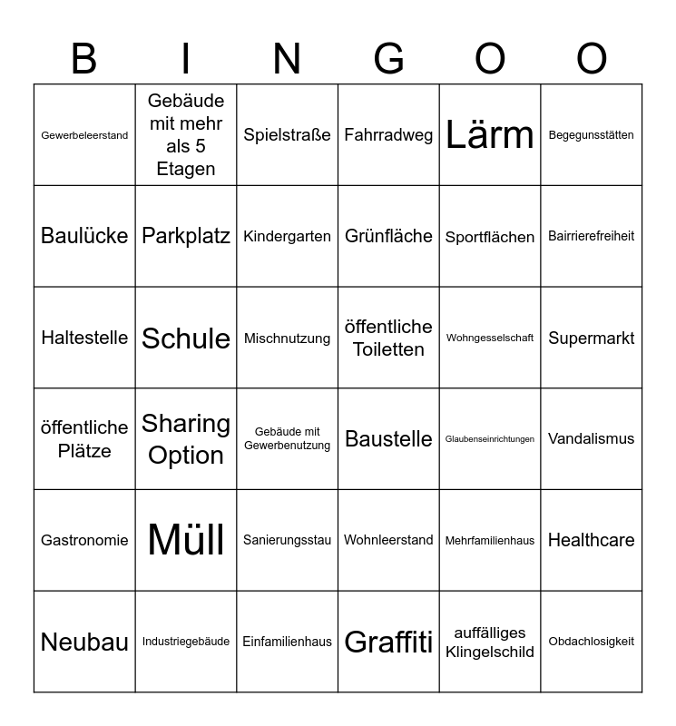 This bingo card has 36 words: öffentliche Plätze, Sharing Option, Einfamilienhaus, Grünfläche, Wohngesselschaft, Supermarkt, Gewerbeleerstand, Industriegebäude, Spielstraße, Wohnleerstand, Sportflächen, Begegunsstätten, Gastronomie, Schule, Kindergarten, Fahrradweg, Mehrfamilienhaus, Vandalismus, Baulücke, Parkplatz, Gebäude mit Gewerbenutzung, Baustelle, Glaubenseinrichtungen, Healthcare, Haltestelle, Gebäude mit mehr als 5 Etagen, Mischnutzung, Graffiti, Lärm, Bairrierefreiheit, Neubau, Müll, Sanierungsstau, öffentliche Toiletten, auffälliges Klingelschild and Obdachlosigkeit.