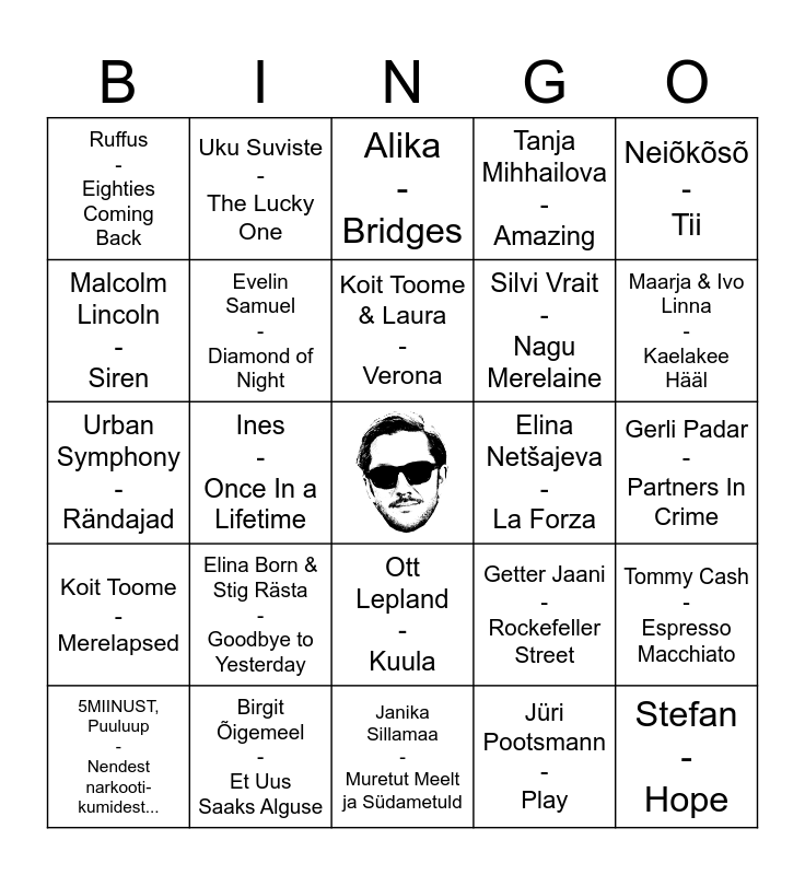This bingo card has a free space and 29 words: 5MIINUST, Puuluup - Nendest narkooti- kumidest..., Maarja - Keelatud Maa, Ines - Once In a Lifetime, Padar & Benton - Everybody, Ruffus - Eighties Coming Back, Alika - Bridges, Evelin Samuel - Diamond of Night, Elina Born & Stig Rästa - Goodbye to Yesterday, Elina Netšajeva - La Forza, Birgit Õigemeel - Et Uus Saaks Alguse, Gerli Padar - Partners In Crime, Stefan - Hope, Janika Sillamaa - Muretut Meelt ja Südametuld, Jüri Pootsmann - Play, Maarja & Ivo Linna - Kaelakee Hääl, Kreisiraadio - Leto Svet, Ott Lepland - Kuula, Koit Toome - Merelapsed, Neiõkõsõ - Tii, Urban Symphony - Rändajad, Getter Jaani - Rockefeller Street, Sahlene - Runaway, Silvi Vrait - Nagu Merelaine, Malcolm Lincoln - Siren, Tanja Mihhailova - Amazing, Uku Suviste - The Lucky One, Tommy Cash - Espresso Macchiato, Koit Toome & Laura - Verona and Victor Crone - Storm.