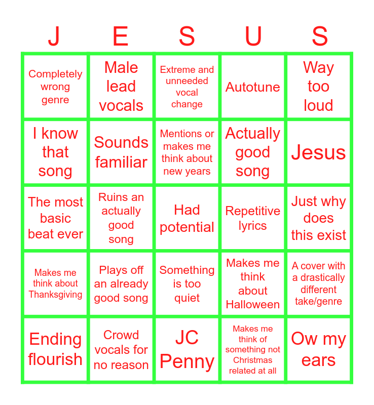 This bingo card has 36 words: A Christmas song (Free), Not Christmas, Preachy, Sounds familiar, Makes me think about Halloween, Makes me think about Thanksgiving, Mentions or makes me think about new years, A simple/singular beat, Way too loud, Overly emotional, Ruins an actually good song, Autotune, Hymn, Repetitive lyrics, Jesus, Completely wrong genre, Ow my ears, Plays off an already good song, Had potential, Extreme and unneeded vocal change, Just why does this exist, A cover with a drastically different take/genre, Crowd vocals for no reason, Ending flourish, JC Penny, Male lead vocals, The most basic beat ever, What did you say?, Actually good song, I know that song, Female lead vocals, An actually good beat, Makes me think of something not Christmas related at all, Something is too quiet, Something is too loud and Horrible mixing.