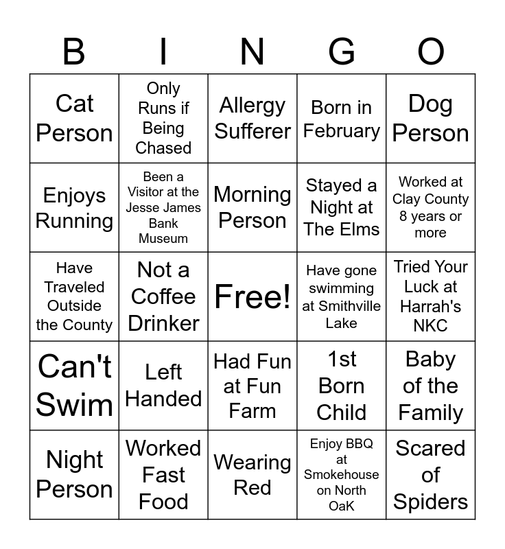 This bingo card has a free space and 24 words: Left Handed, Worked Fast Food, Morning Person, Night Person, Dog Person, Cat Person, Enjoys Running, Only Runs if Being Chased, Have gone swimming at Smithville Lake, Had Fun at Fun Farm, Stayed a Night at The Elms, Have Traveled Outside the County, 1st Born Child, Baby of the Family, Been a Visitor at the Jesse James Bank Museum, Enjoy BBQ at Smokehouse on North OaK, Tried Your Luck at Harrah's NKC, Allergy Sufferer, Worked at Clay County 8 years or more, Not a Coffee Drinker, Scared of Spiders, Can't Swim, Born in February and Wearing Red.