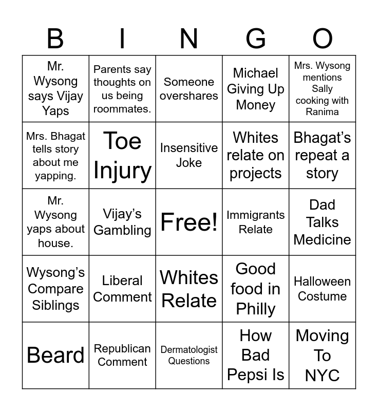 This bingo card has a free space and 24 words: Liberal Comment, Republican Comment, Insensitive Joke, Beard, Mrs. Wysong mentions Sally cooking with Ranima, Mr. Wysong says Vijay Yaps, Mrs. Bhagat tells story about me yapping., Parents say thoughts on us being roommates., Immigrants Relate, Whites Relate, Whites relate on projects, Mr. Wysong yaps about house., Good food in Philly, Halloween Costume, Toe Injury, How Bad Pepsi Is, Dad Talks Medicine, Someone overshares, Bhagat’s repeat a story, Vijay’s Gambling, Moving To NYC, Wysong’s Compare Siblings, Michael Giving Up Money and Dermatologist Questions.