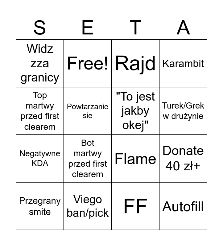 This bingo card has 16 words: Viego ban/pick, Donate 40 zł+, Rajd, Widz zza granicy, Negatywne KDA, Free!, Flame, FF, Top martwy przed first clearem, Powtarzanie sie, Przegrany smite, Karambit, Bot martwy przed first clearem, Turek/Grek w drużynie, "To jest jakby okej" and Autofill.