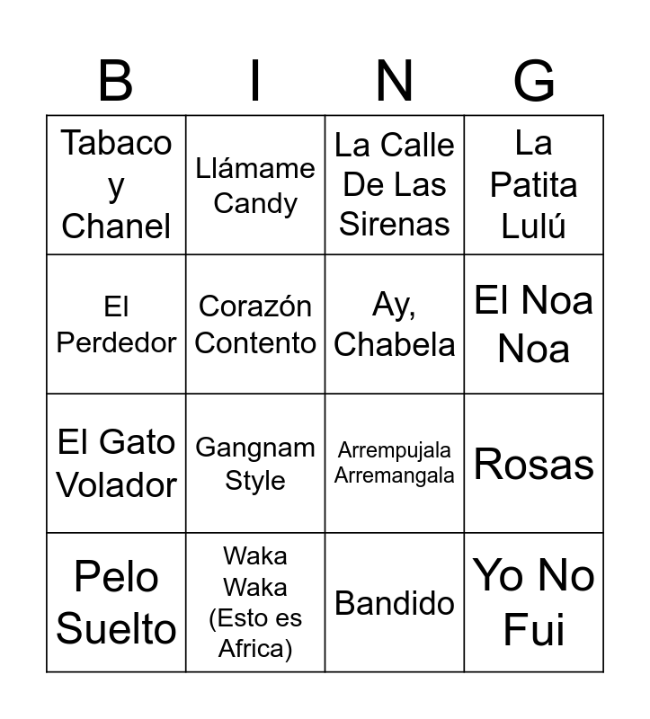 This bingo card has 107 words: Free!, No Hay Pesos, Rosas, Sálvame, Don, Andar Conmigo, A Dios Le Pido, Tequila, Rayando el Sol, Para No Verte Más, Lobo-hombre en París, De Música Ligera, El Baile del Sapito, Ratón Vaquero, En un Bosque de la China, Baby Shark, Llámame Candy, Flores Amarillas, La Vecindad Del Chavo, Hombres de Acción Serán Hoy, El Baile del Gorila, The Ketchup Song (Aserejé), Macarena, Colgando en tus manos, Amárrame, El Perdedor, Corazón Contento, La Patita Lulú, La Feria de Cepillín, ¿Y Si Hacemos Un Muñeco?, No Hablaré, La Gata Bajo La Lluvia, Vuela, Vuela (Voyage, Voyage), La Bomba, Mujeres, La Calle De Las Sirenas, Enloquéceme, Bella Señora, Azúcar Amargo, Pelo Suelto, Bailando, Apnea, Techno Cumbia, Un Millón de Primaveras, Amorcito corazón, Ay, Chabela, Carta a ufemia, El Noa Noa, El Baile del Beeper, Waka Waka (Esto es Africa), Ai Se Eu Te Pego, Gangnam Style, Yo No Fui, Estos Celos, Peces E Iguanas, La Incondicional, Azul, Me Gustas Tu, Caraluna, Tabaco y Chanel, Ahora Te Puedes Marchar, De Los Besos Que Te Di, Rosa Pastel, Heterocromía, Mayonesa, Mesa que mas aplauda, El Meneaito (Panama), La Chona, Sopa De Caracol, El venado, Azúcar, Arrempujala Arremangala, La del Moño Colorado, El Tucanazo, Soldado Del Amor, Yo No Sé Mañana, Vivir Mi Vida, Talento De Televisión, La Vida Es Un Carnaval, La Noche Mas Linda, En Privado, Perdonarte, ¿Para Qué?, DtMF, Te Encontre, Saturno, 1 2 3, No Tengo Dinero, Procura, La Matraca, La Negra Tiene Tumbao, El Gato Volador, Beso en la Boca, Ciega, Sordomuda, Livin' la Vida Loca - Spanish Version, La Bilirrubina, Torero, Tacones Rojos, La Botella, Pegame Tu Vicio, Dale Vieja Dale, Tu Sonrisa, Noches de Fantasía, Abusadora, Tú No Eres Para Mi, Las de la Intuición, Bandido and Amante Bandido.