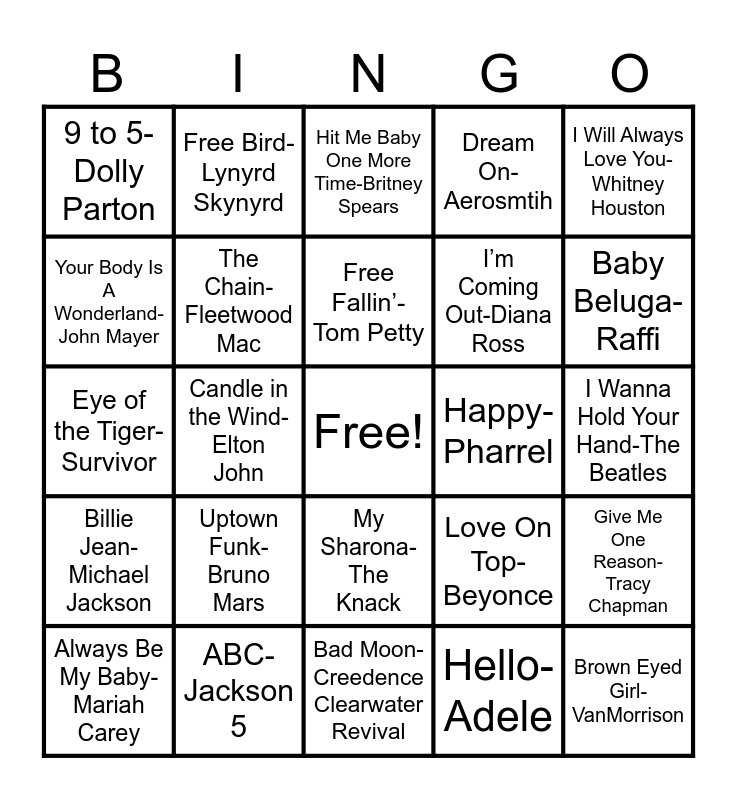 This bingo card has a free space and 41 words: Back in Black-AC/DC, Eye of the Tiger-Survivor, Sweet Caroline-Neil Diamond, The Chain-Fleetwood Mac, ABC-Jackson 5, My Sharona-The Knack, Free Fallin’-Tom Petty, Jack and Diane-John Mellancamp, I Will Always Love You-Whitney Houston, Billie Jean-Michael Jackson, Candle in the Wind-Elton John, Dream On-Aerosmtih, Brown Eyed Girl-VanMorrison, I Wanna Hold Your Hand-The Beatles, Happy-Pharrel, Uptown Funk-Bruno Mars, Play the Game-Queen, 9 to 5-Dolly Parton, Holy-Justin Bieber, Hit Me Baby One More Time-Britney Spears, Give Me One Reason-Tracy Chapman, Neon Moon-Brooks and Dunn, Bad Moon-Creedence Clearwater Revival, I’m Coming Out-Diana Ross, Sugar-Maroon 5, Can’t Help Falling in Love-Elvis Presley, Hello-Adele, Circles-Post Malone, Baby Beluga-Raffi, The Gambler-Kenny Rogers, Summers-Morgan Wallen, Free Bird-Lynyrd Skynyrd, Always Be My Baby-Mariah Carey, Born in the U.S.A-Bruce Springsteen, Love On Top-Beyonce, Your Body Is A Wonderland-John Mayer, It’s Gonna Be Me-N’SYNC, I Wanna Dance With Somebody-Whitney Houston, Take Me Home, Country Roads-John Denver, Stand By Me-Ben E. King and Don’t Stop Believing-Journey.
