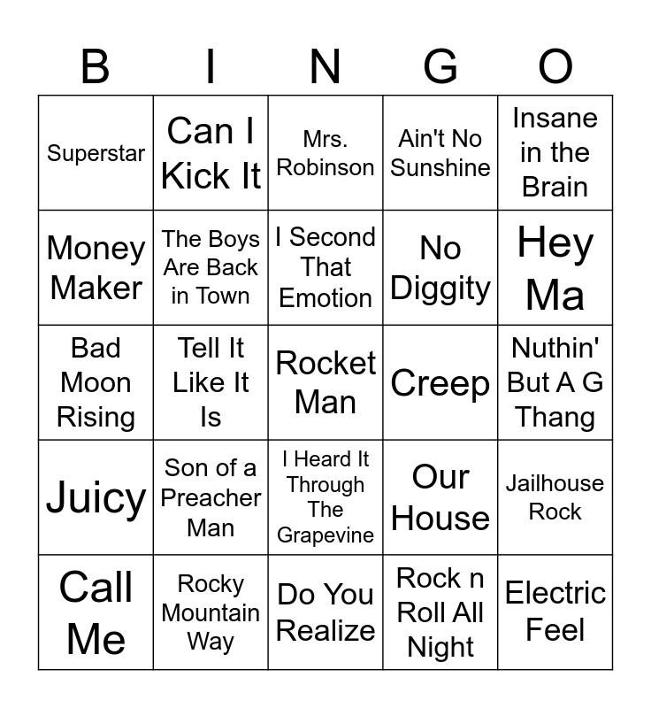 This bingo card has 72 words: Free!, Can I Kick It, Tell It Like It Is, Respect, Sail, Loser, Ain't No Sunshine, White Wedding, No Diggity, No Rain, Call Me, Stir it Up, Hey Ma, Superstar, Wild World, Bad Moon Rising, Our House, Insane in the Brain, Space Oddity, Nuthin' But A G Thang, Son of a Preacher Man, Rocket Man, Jailhouse Rock, Layla, The Final Countdown, Can You Get To That, Bad To The Bone, Dirty Harry, Welcome To The Jungle, You Don't Mess Around With Jim, Rocky Mountain Way, Imagine, Walk the Line, Ruby, Rock n Roll All Night, The Breaks, Kashmir, Walk On The Wild Side, Money Maker, Thrift Shop, I Heard It Through The Grapevine, Electric Feel, Thriller, Unforgettable, Don't Speak, Juicy, Sitting On The Dock Of The Bay, Diamonds On the Soles of Her Shoes, Tweezer, Money, 1999, Bohemian Rhapsody, Ignition, Creep, Black Magic Woman, It Wasn't Me, Mrs. Robinson, I Second That Emotion, Magic Carpet Ride, Bring 'Em Out, Midnight Rider, London Calling, Hotel California, Do You Realize, St. Stephen, ABC, The Boys Are Back in Town, Free Fallin', Dancin' In The Moonlight, California Love, Ice Ice Baby and Low Rider.