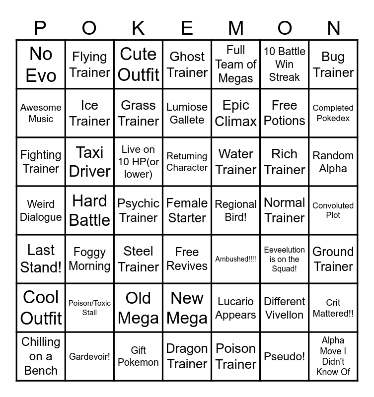 This bingo card has a free space and 76 words: Random Shiny, Cool Outfit, Cute Outfit, Lucario Appears, Charizard!!!, Greninja?!, Eeveelution is on the Squad!, Grass Starter, Ambushed!!!!, Surprise Attack!, Alpha Move I Didn't Know Of, Millionaire?!, Awesome Music, 10 Battle Win Streak, 20 Battle Win Streak, Epic Climax, Convoluted Plot, Free Potions, Rival Battle!, Full Team of Megas, Free Revives, Lumiose Gallete, Bug Trainer, Flying Trainer, Ghost Trainer, Dragon Trainer, Chilling on a Bench, Gift Pokemon, Free Pokeballs, One ball Catch, Steel Trainer, Dark Trainer, Back Strike Capture, Water Trainer, Grass Trainer, Ice Trainer, Fire Trainer, Critical Capture, Fighting Trainer, Psychic Trainer, New Mega, Old Mega, Pseudo!, Pikachu or Clone, Snowy Area??, Regional Bird!, Random Alpha, No Evo, Fossil!, Fairy Trainer, Normal Trainer, Returning Character, Rock Trainer, Ground Trainer, Poison Trainer, Electric Trainer, Last Stand!, Different Vivellon, Hisui!!!, Crit Mattered!!, Live on 10 HP(or lower), Live on 1(HP), Timely Delivery, Rainy Day, Red Screen!!!, Poison/Toxic Stall, Completed Pokedex, Foggy Morning, Gengar!!, Gardevoir!, Rich Trainer, Taxi Driver, Weird Dialogue, Delivery Person, Hard Battle and Item Spam.