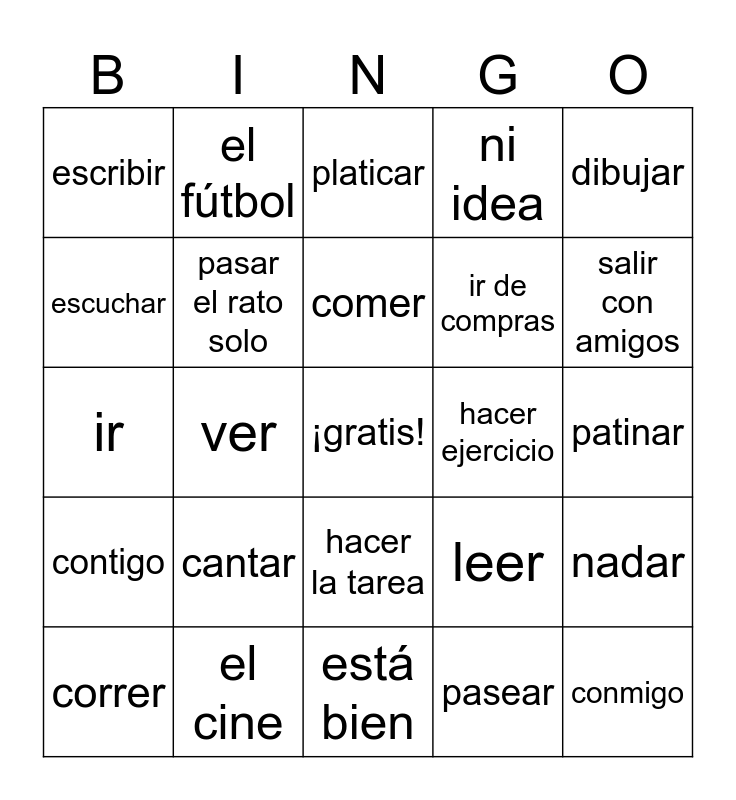 This bingo card has a free space and 24 words: cantar, el cine, comer, correr, dibujar, escribir, escuchar, el fútbol, hacer ejercicio, hacer la tarea, ir de compras, ir, leer, nadar, pasar el rato solo, pasear, patinar, platicar, salir con amigos, ver, conmigo, contigo, ni idea and está bien.