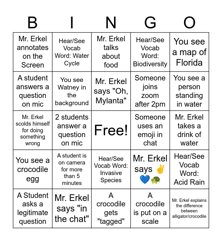 This bingo card has a free space and 29 words: A Student asks a legitimate question, Taylor drops a resource in the chat, 2 students answer a question on mic, Hear/See Vocab Word: Food Chain, Mr. Erkel annotates on the Screen, Mr. Erkel talks about food, You see Watney in the background, A student is on camera for more than 5 minutes, Someone uses an emoji in chat, Mr. Erkel says "in the chat", Mr. Erkel takes a drink of water, Mr. Erkel explains the difference between alligator/crocodile, A crocodile gets "tagged", A crocodile is put on a scale, You see a person standing in water, Somebody is in a boat, Hear/See Vocab Word: Invasive Species, You see a crocodile egg, You see a map of Florida, Mr. Erkel scolds himself for doing something wrong, Mr. Erkel says ✌️💙🐢, Mr. Erkel says "this will be on the case study", Someone joins zoom after 2pm, A student answers a question on mic, Hear/See Vocab Word: Biodiversity, Hear/See Vocab Word: Water Cycle, Hear/See Vocab Word: Acid Rain, Mr. Erkel says "Oh, Mylanta" and Mr. Erkel says your name out loud.