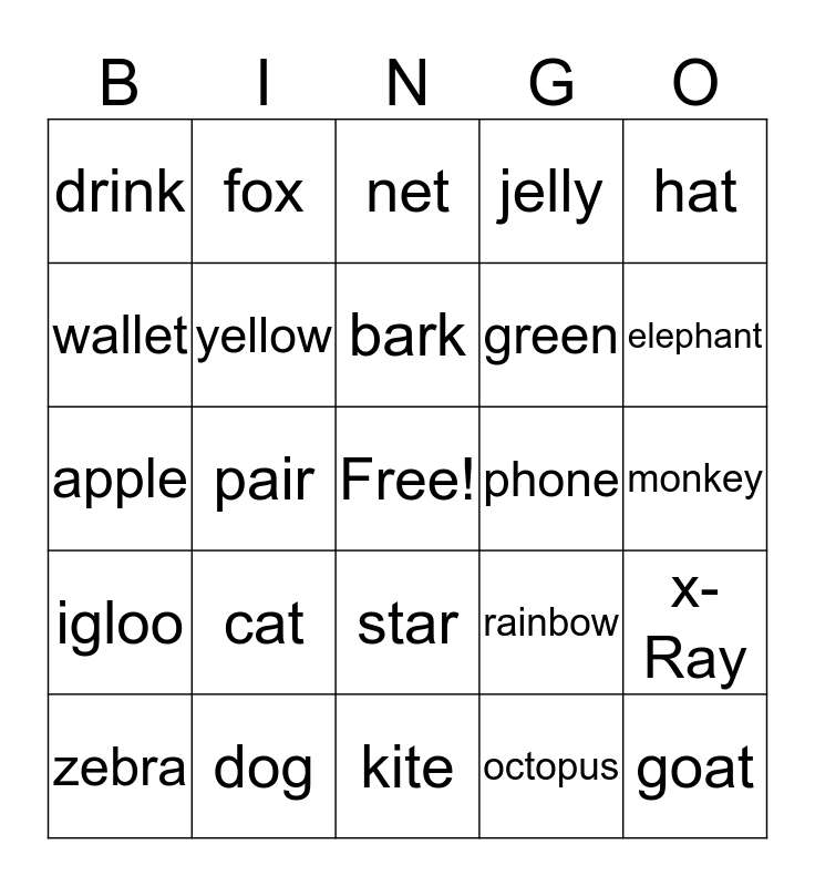This bingo card has a free space and 24 words: cat, dog, bark, zebra, hat, drink, wallet, fox, phone, star, green, apple, rainbow, x-Ray, yellow, octopus, monkey, net, elephant, pair, goat, igloo, jelly and kite.