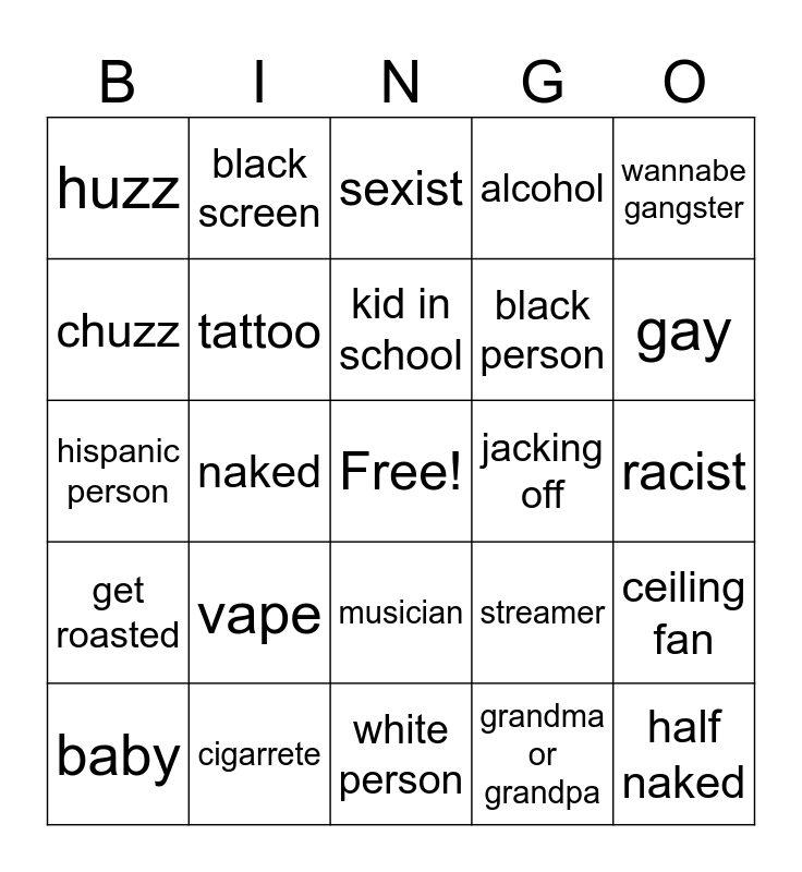This bingo card has a free space and 24 words: vape, cigarrete, kid in school, baby, wannabe gangster, huzz, chuzz, black screen, jacking off, musician, black person, hispanic person, streamer, ceiling fan, tattoo, grandma or grandpa, racist, sexist, gay, naked, half naked, get roasted, alcohol and white person.