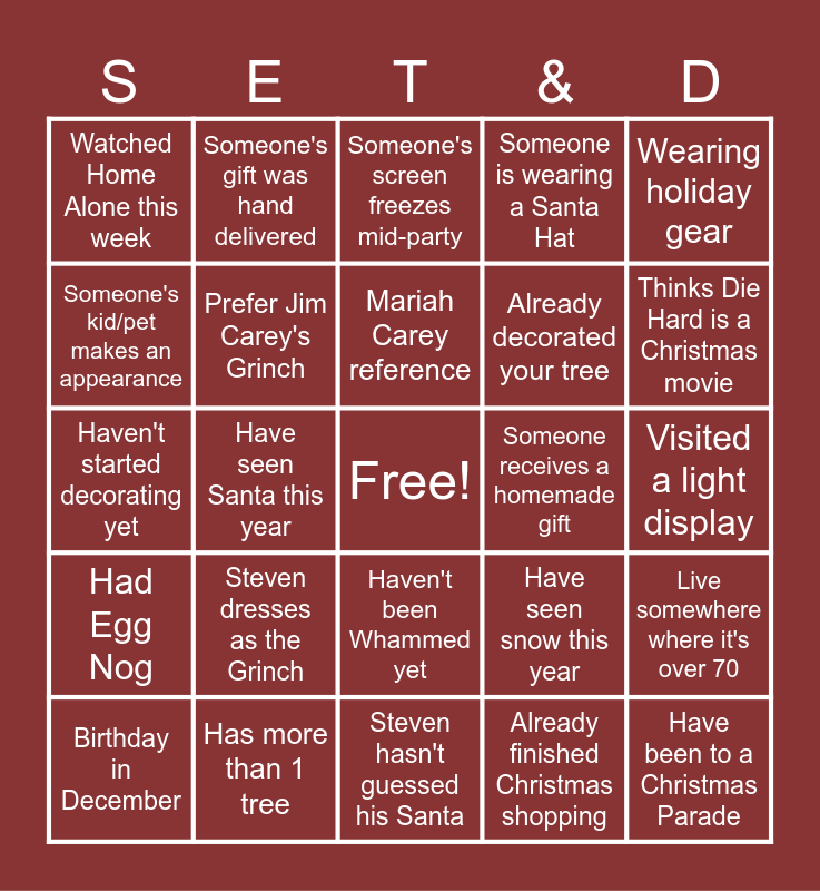 This bingo card has a free space and 24 words: Steven dresses as the Grinch, Has more than 1 tree, Mariah Carey reference, Birthday in December, Wearing holiday gear, Watched Home Alone this week, Someone's kid/pet makes an appearance, Someone's gift was hand delivered, Someone receives a homemade gift, Haven't been Whammed yet, Already decorated your tree, Haven't started decorating yet, Have seen snow this year, Live somewhere where it's over 70, Prefer Jim Carey's Grinch, Already finished Christmas shopping, Visited a light display, Someone's screen freezes mid-party, Thinks Die Hard is a Christmas movie, Have seen Santa this year, Have been to a Christmas Parade, Had Egg Nog, Someone is wearing a Santa Hat and Steven hasn't guessed his Santa.