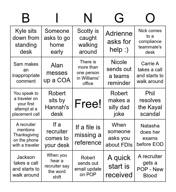 This bingo card has a free space and 24 words: If a recruiter comes to your desk, When you hear a recruiter say the word shift, There is more than one person in Williams' office, Jackson takes a call and starts to walk around, Nick comes to a compliance teammate's desk, Kyle sits down from standing desk, Sam makes an inappropriate comment, Someone asks to go home early, Robert makes a silly dad joke, If a file is missing a reference, Nicole sends out a teams reminder, You speak to a traveler on your first attempt at a placement call, When someone asks you about FDIs, Natasha does her exams before EOD, Alan messes up a COA, A quick start is received, Phil resolves the Kayal scandal, Scotty is caught walking around, Carrie A takes a call and starts to walk around, Robert sits by Hannah's desk, A recruiter gets a POP - New Blood, A recruiter mentions Thanksgiving on the phone with a traveler, Adrienne asks for help :) and Robert sends out email update on POP.