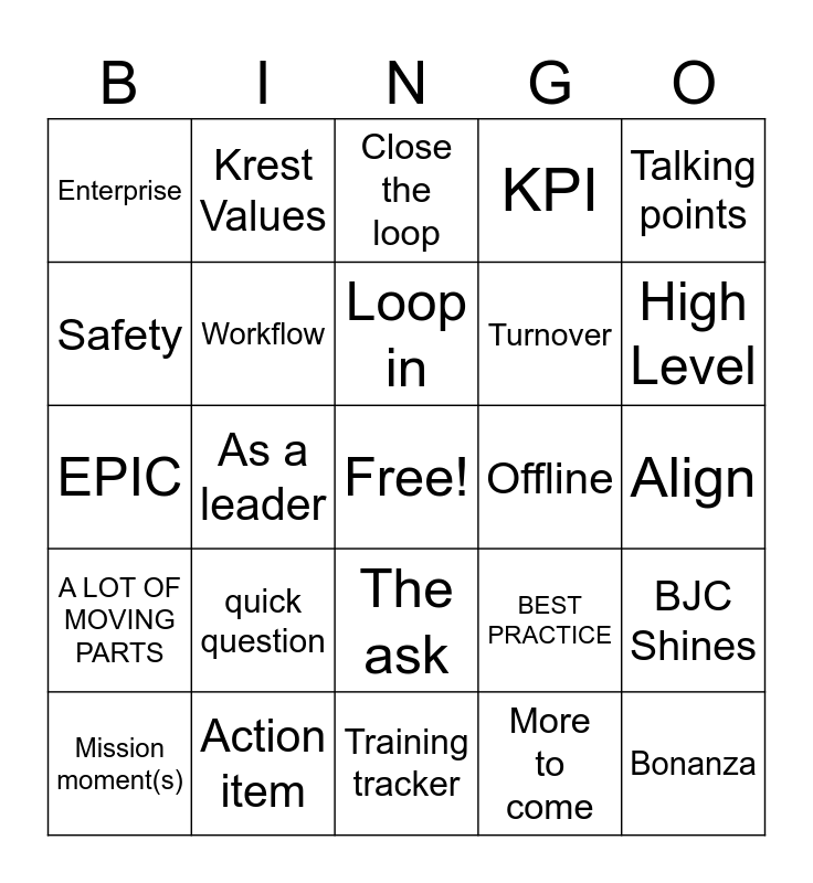 This bingo card has a free space and 32 words: More to come, brb, As a leader, Cadance, A LOT OF MOVING PARTS, Workflow, Talking points, BJC Shines, Krest Values, Drop in the chat, Loop in, Close the loop, Cascade, Standard work, Offline, Touch base, Mission moment(s), EPIC, The ask, quick question, BEST PRACTICE, Call out, Align, Action item, Bonanza, KPI, Turnover, Safety, Enterprise, Training tracker, Realign and High Level.