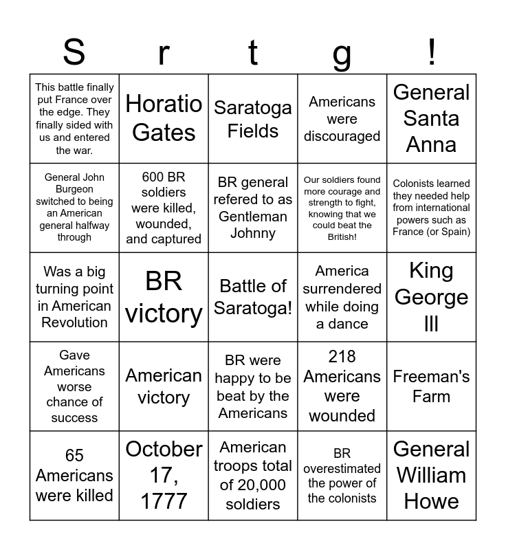 This bingo card has a free space and 24 words: American victory, October 17, 1777, BR general refered to as Gentleman Johnny, 65 Americans were killed, General Santa Anna, This battle finally put France over the edge. They finally sided with us and entered the war., General John Burgeon switched to being an American general halfway through, Horatio Gates, America surrendered while doing a dance, BR were happy to be beat by the Americans, Our soldiers found more courage and strength to fight, knowing that we could beat the British!, Was a big turning point in American Revolution, 218 Americans were wounded, Freeman's Farm, 600 BR soldiers were killed, wounded, and captured, BR overestimated the power of the colonists, King George lll, Saratoga Fields, Colonists learned they needed help from international powers such as France (or Spain), BR victory, General William Howe, Gave Americans worse chance of success, Americans were discouraged and American troops total of 20,000 soldiers.