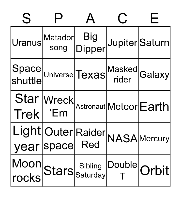 This bingo card has 69 words: Free!, Earth, Moon, Sun, Stars, Pluto, Jupiter, Mars, Saturn, Venus, Mercury, Neptune, Uranus, Big Dipper, Little Dipper, Wreck ‘Em, Raider Red, Masked rider, Milky way, Light year, Meteor, NASA, Galaxy, To infinity and beyond, Solar system, Gravity, Shooting star, Lubbock, Double T, Flying tortillas, Matador song, Guns Up!, Will Rogers, Victory Bells, Blarney Stone, Alien, Telescope, Eclipse, Space shuttle, Orbit, Outer space, Astronaut, Asteroid, Crater, Constellation, Moon rocks, Rocket, Comet, Satellite, Universe, Texas, Spacesuit, Blast off!, Sibling Saturday, Buzz Light-year, Texas Tech Fight Song, Scarlet & Black, Space Jam, Star Wars, Star Trek, Black Hole, Astrology, Axis, Nebula, Astronomy, Intergalactic, Stratosphere, Interstellar and Space Sibs.