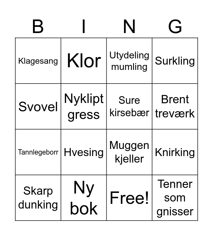This bingo card has 17 words: Free!, Skarp dunking, Utydeling mumling, Klagesang, Hvesing, Surkling, Knirking, Sure kirsebær, Brent treværk, Nyklipt gress, Ny bok, Muggen kjeller, Svovel, Klor, Tannlegeborr, Rødsprit and Tenner som gnisser.