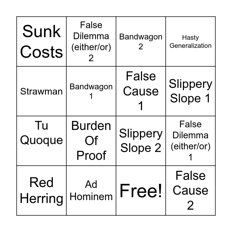 This bingo card has 16 words: Ad Hominem, False Dilemma (either/or) 1, Bandwagon 2, Sunk Costs, Tu Quoque, False Dilemma (either/or) 2, Slippery Slope 2, Free!, Strawman, Bandwagon 1, Red Herring, Hasty Generalization, Burden Of Proof, Slippery Slope 1, False Cause 1 and False Cause 2.