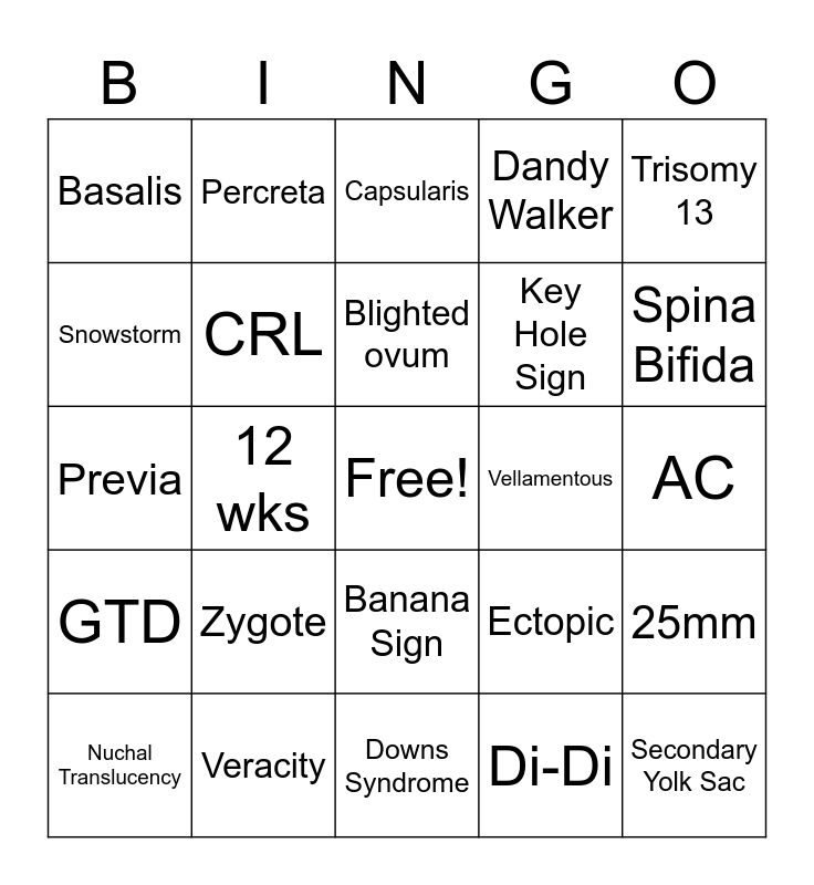 This bingo card has a free space and 44 words: Amnion, Secondary Yolk Sac, Battledore, Nuchal Translucency, Cystic Hygroma, Di-Di, Capsularis, Low Lying, Trisomy 13, Veracity, Dandy Walker, Vellamentous, Banana Sign, Zygote, Informed Consent, Downs Syndrome, Poly, Previa, HCG, Spina Bifida, Percreta, Embryo, Mono-Mono, Basalis, HCG, AC, PAPPA, AFP, Ectopic, GTD, <1cm, 25mm, Thalamus, Choroid Plexus, 12 wks, Chorion Villi Sampling, Theca Lutein Cysts, Subchorionic Hemorrhage, Blighted ovum, Snowstorm, Key Hole Sign, Oligo, CRL and Interstitial.