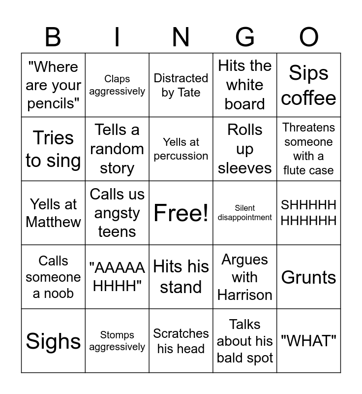 This bingo card has a free space and 25 words: Sighs, "AAAAA HHHH", Yells at percussion, Talks about his bald spot, Threatens someone with a flute case, "Where are your pencils", Claps aggressively, Distracted by Tate, Rolls up sleeves, Grunts, Yells at Matthew, Tells a random story, Argues with Harrison, "WHAT", Tries to sing, Stomps aggressively, Scratches his head, Hits the white board, SHHHHH HHHHHH, Calls someone a noob, Calls us angsty teens, Hits his stand, Silent disappointment, Sips coffee and Yells at the people in the hallway for being too loud.