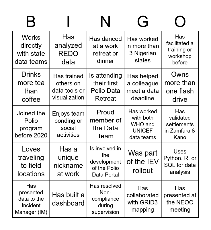This bingo card has a free space and 24 words: Has a unique nickname at work, Has built a dashboard, Is attending their first Polio Data Retreat, Has presented data to the Incident Manager (IM), Has facilitated a training or workshop before, Works directly with state data teams, Drinks more tea than coffee, Has analyzed REDO data, Has worked with both WHO and UNICEF data teams, Is involved in the development of the Polio Data Portal, Has helped a colleague meet a data deadline, Joined the Polio program before 2020, Was part of the IEV rollout, Uses Python, R, or SQL for data analysis, Has trained others on data tools or visualization, Has collaborated with GRID3 mapping, Has validated settlements in Zamfara & Kano, Has danced at a work retreat or dinner, Owns more than one flash drive, Enjoys team bonding or social activities, Has presented at the NEOC meeting, Loves traveling to field locations, Has worked in more than 3 Nigerian states and Has resolved Non-compliance during supervision.