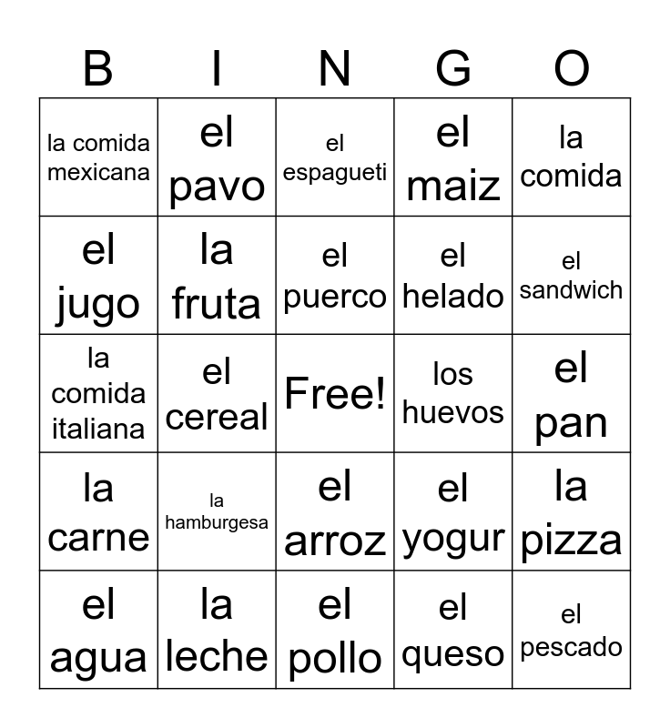 This bingo card has a free space and 29 words: el agua, la bebida, el cereal, la comida china, la comida mexicana, el espagueti, la fruta, la hamburgesa, los huevos, la leche, el pan, el pescado, el pollo, el queso, el sandwich, las verduras, el arroz, la carne, la comida, la comida italiana, el yogur, los frijoles, el helado, el jugo, el maiz, el pavo, la pizza, el puerco and la soda.